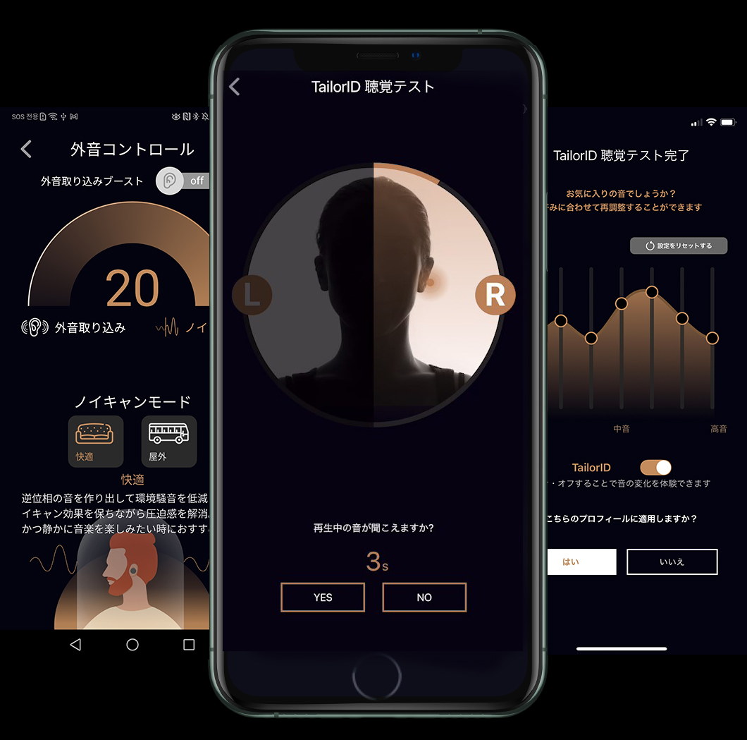 聴感計測によりユーザーの実際の聞こえ方に応じてフィードバックを返し、各個人にとって最適化された音質を提供します。たった3つのステップで、イヤホンが自分の耳にぴったりのサウンドに仕上がります。